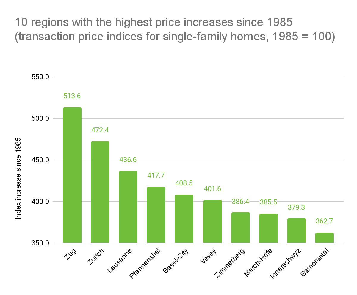 To illustrate, consider the MS region (city) of Zurich: the average market value of a mid-range single-family home increased from an index value of 100 in 1985 to 472 today. This means that the value of a typical property has nearly quintupled. The ranking of the ten regions with the highest price increases highlights how strongly property values have developed in urban and economically attractive areas.
